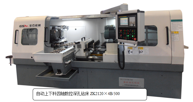 應廣大用戶的要求,金石機械在之前制造四軸槍鉆機床的基礎上,針對工件裝卸的不便及費時的缺點,研發了如下自動上下料的四軸深孔鉆床。大大提高了槍鉆機床的利用率,并降低了操作工人的勞動強度。很快得到廣泛應用。