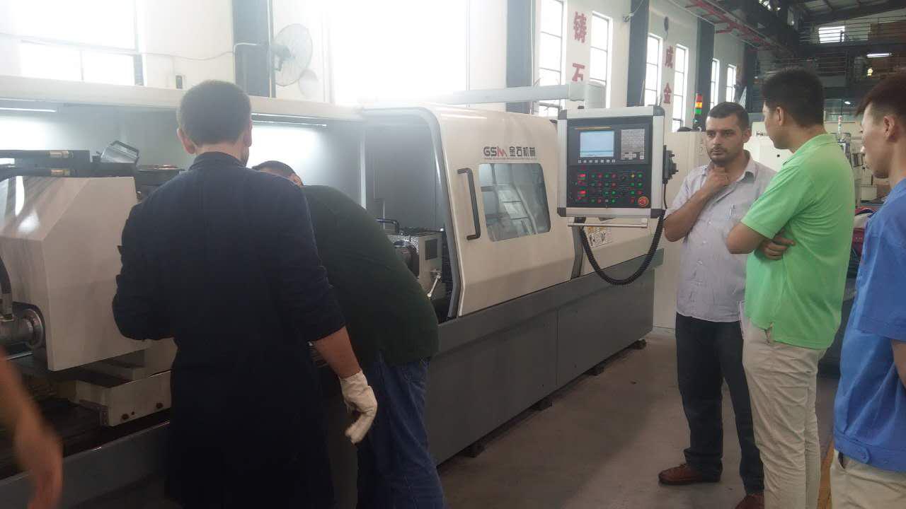 我司開始從機床的設計、嚴謹的裝配工藝,設備的零件生產、外觀,我們都謹慎對待一絲不茍。客戶在我公司外貿部領導的陪同下,詳細參觀了我公司裝配線,并親自操作試用了機床。